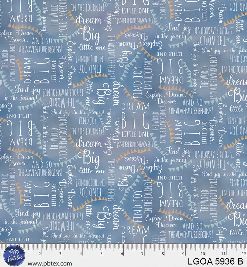 P & B Textiles Let's Go On An Adventure Phrases Blue Fabric