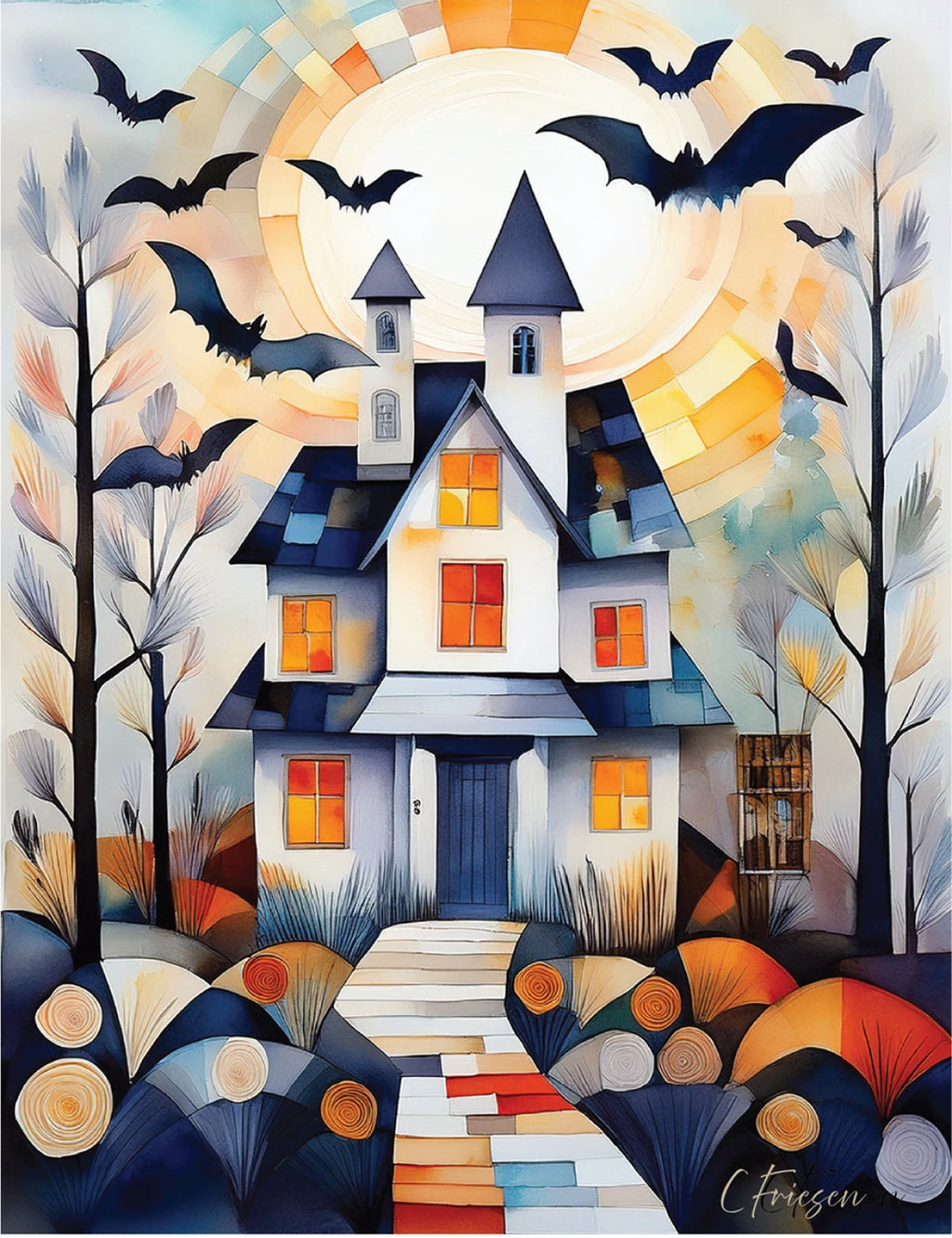 "Batty Manor" signature quiltscape art notecard. Rectangular A2 sized (4.25 x 5.5 inch) printed on quality 100 lb stock with matching white envelope. Blank inside. This design is part of Quiltberry Farm's Homemade Harvest Collection.