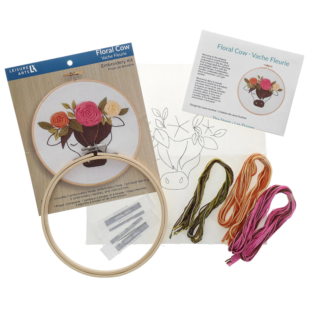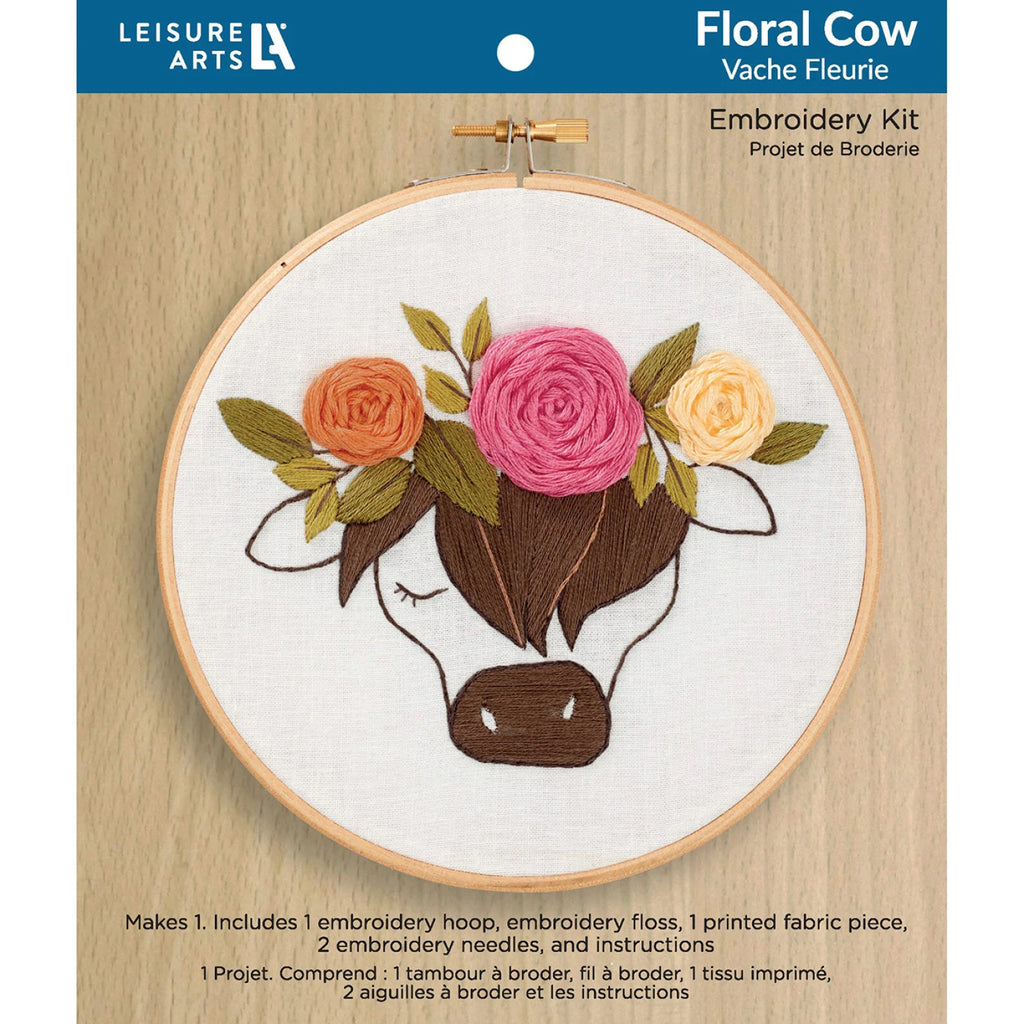 Leisure Arts Embroidery Kit 6" Floral Highland Cow- Printed embroidery design features a dimensional highland cow with delicate floral accents. Includes 6" wooden embroidery hoop, embroidery floss, printed fabric, 2 embroidery needles and full-color, step-by-step instructions. Use the embroidery hoop to keep the fabric taught and then to display your project. Makes 1 design. Colors and contents may vary.