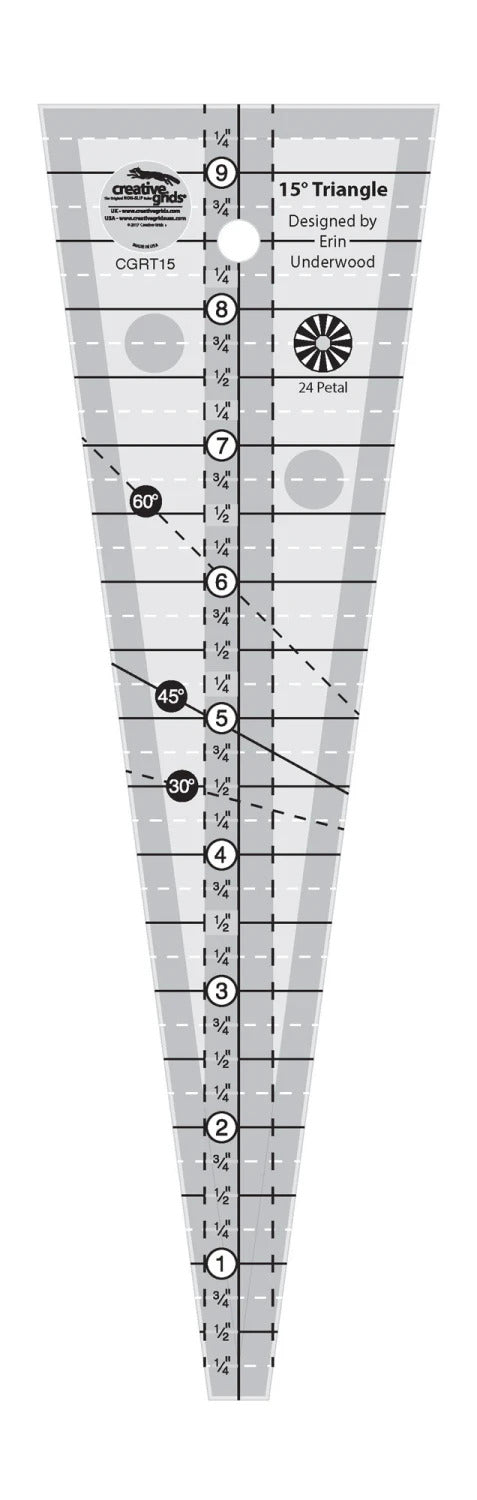 This 15 Degree Triangle Ruler designed by Erin Underwood for Creative Grids® cuts wedges for making Fans, Dresden Plates, and more.