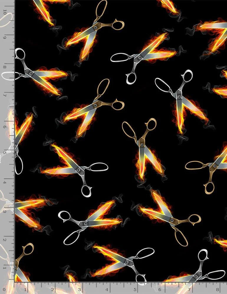 P & B Textiles You've Got Style Flaming Scissors Black Fabric ONLINE PURCHASE ONLY