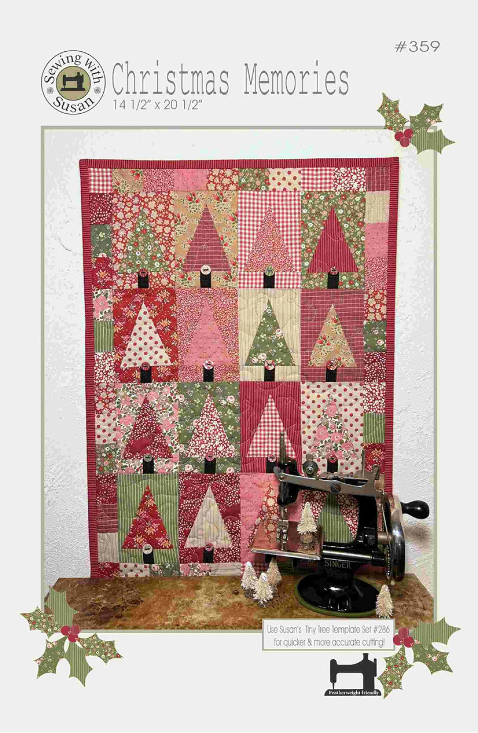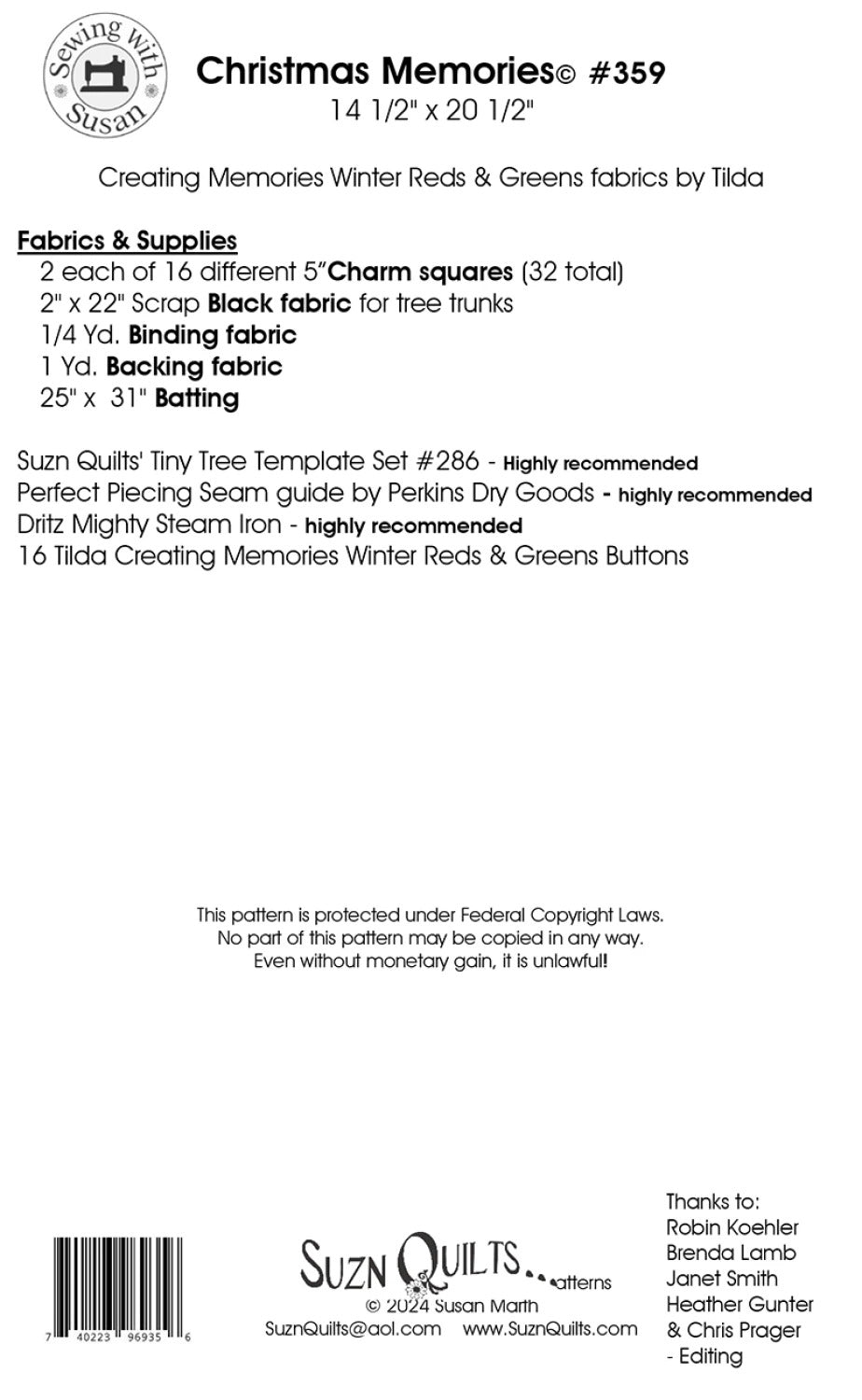 Part of a seasonal series, recreate those warm childhood Christmas memories by sewing my cute Christmas Memories quilt! This cute little quilt is perfect for Christmas decorating or perhaps the perfect gift for a little doll! My very versatile Tree Template sets are great additions to you & your customers’ template stash. It's sewn with 5" charm squares & just a bit of yardage which will make kitting a breeze. Buttons are a cute bonus! Paper templates are included in pattern, but my Tiny Tree Template Set SUZ286 makes for quicker & more accurate cutting. Finished quilt size is 14.5 in. x 20.5 in.