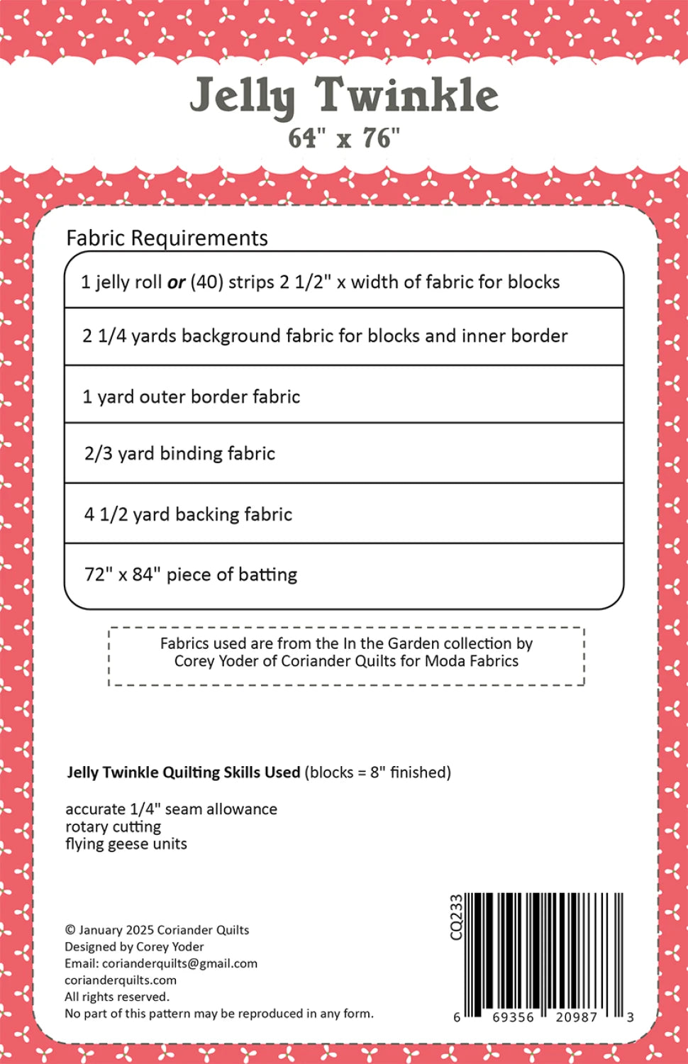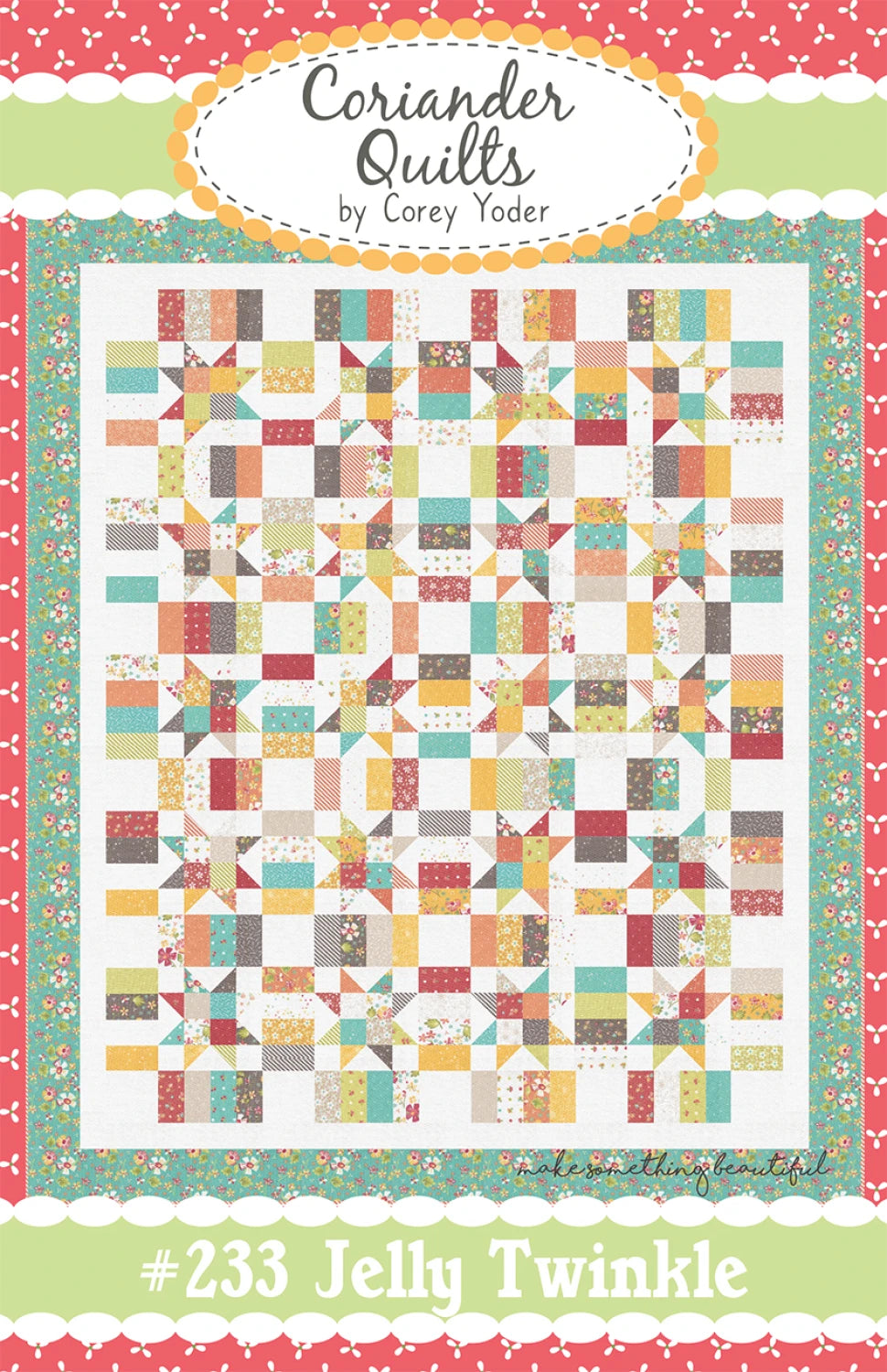 The Jelly Twinkle Quilt pattern designed by Corey Yoder of Coriander quilts is a full color booklet type pattern with detailed illustrations and instructions. The quilt finishes at 64" x 76" and is a jelly roll friendly quilt pattern. It features the In the Garden fabric line by Corey Yoder of Coriander Quilts for Moda Fabrics.