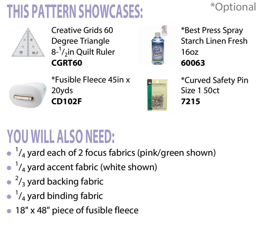 This darling table runner is made with two different sizes of 60-degree triangles. It is pieced in sections, eliminating the need for any inset points. With only three fabrics and two sizes of triangles, this can truly be completed in an afternoon!