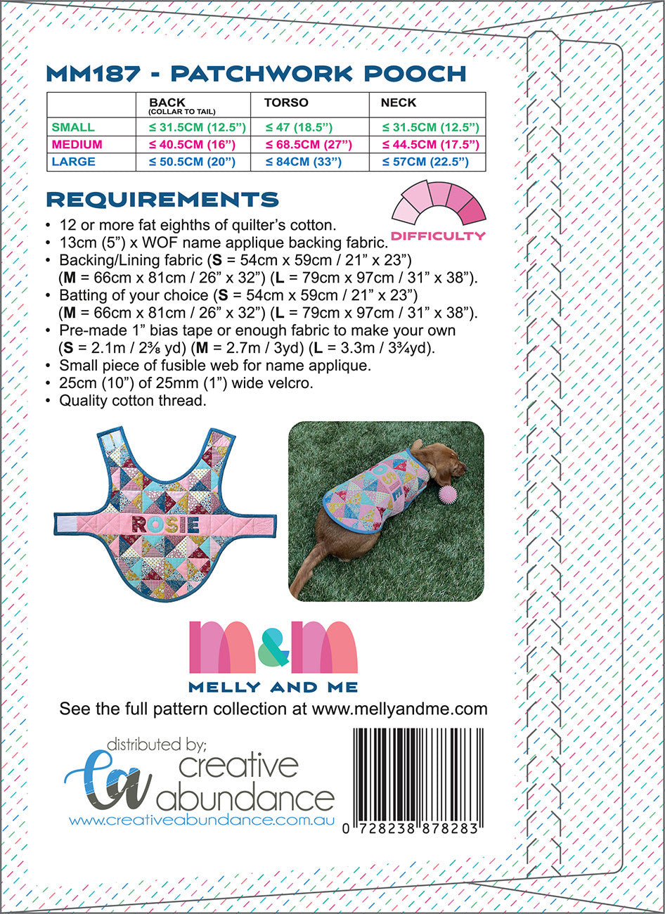 Discover the joy of patchwork fashion for your furry friend! Introducing our vibrant Patchwork Quilt Jacket for dogs, because why should humans have all the fun? With its personalized name appliqué and harness loop hole, this jacket is ideal for strolls in the park, cozy winter mornings, or making a statement at doggy day care. Get ready for your pup to be the envy of the neighborhood doggos! Another fantastic scrap-using project awaits. This printed pattern contains full photographic step-by-step instructions and full-sized templates to create your own Patchwork Pooch Jacket. This sewing pattern is recommended for beginner to intermediate sewers. Sizes Included - Size Small, Medium and Large. Please see my back cover image that shows sizing. It may not suit extra small or extra large dog breeds.