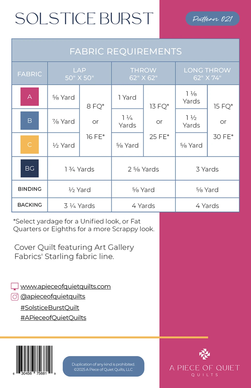 Solstice Burst Quilt brings dynamic energy to your quilting with bold star-inspired geometry and layered movement. Designed for confident beginners, this pattern shines in both modern and traditional fabrics—perfect for featuring your favorite prints. Available in three sizes: lap (50” x 50”), throw (62” x 62”), and long throw (62” x 74”). The pattern includes detailed diagrams, step-by-step instructions, and coloring sheets for easy planning. Bring a burst of brilliance to your quilting with Solstice Burst!