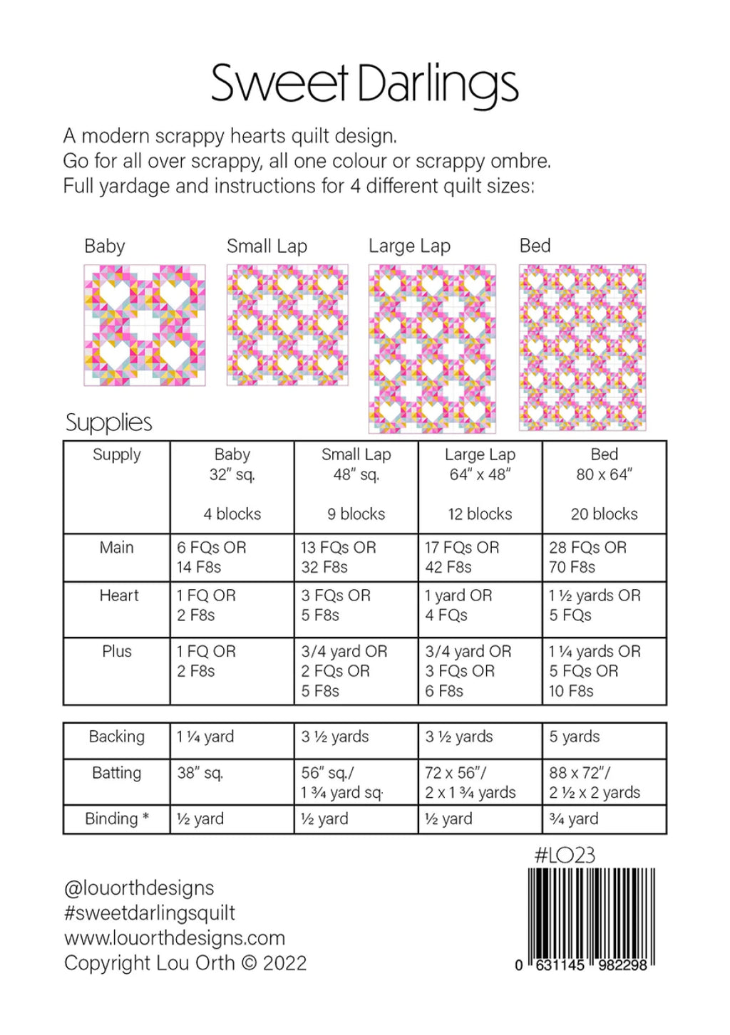 The Sweet Darlings pattern includes instructions for creating a mixed colors quilt and guidance on how to achieve a super scrappy rainbow version. Full written and illustrated instructions for all 4 sizes (Baby, Small lap, Large lap and Bed.)