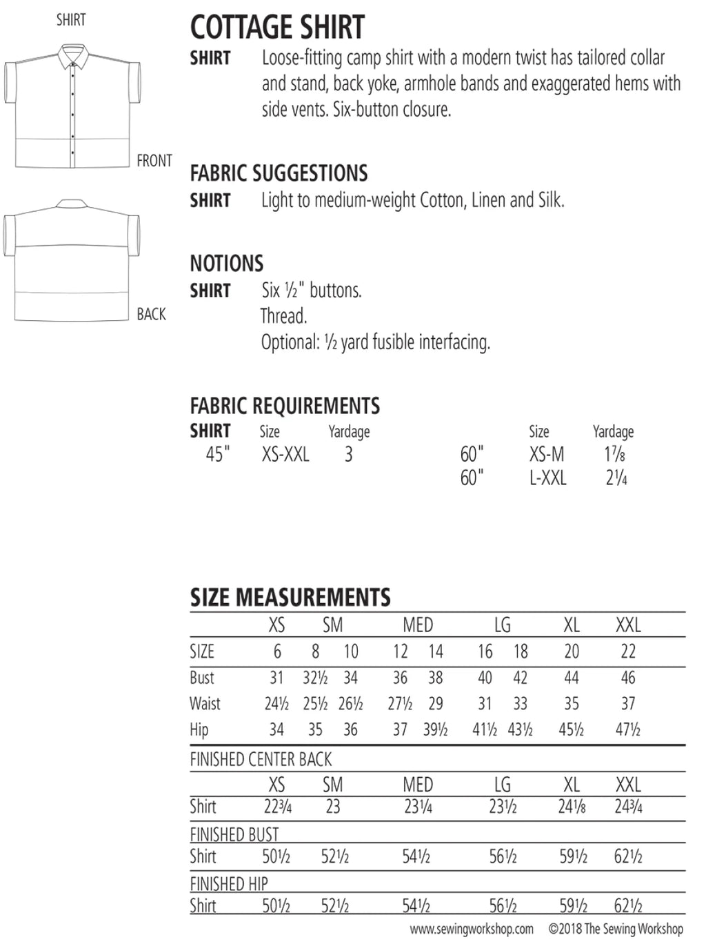 Fabric Suggestions: Light to medium-weight Cotton, Linen and Silk.