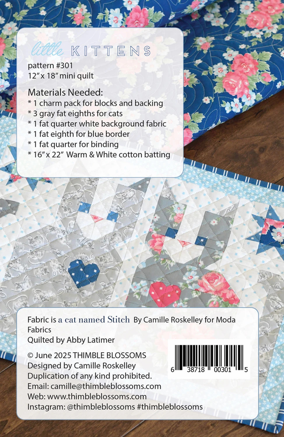The most delightful little mini quilt featuring two darling cats. 12” x 18”. A cat named Stitch fabric collection by Camille Roskelley. Full color pattern.
