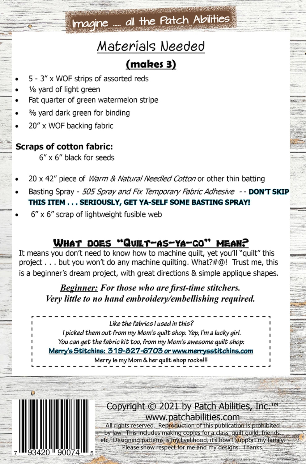 What a great place mat for summer, or any other time of the year. The juicy watermelon will look great on picnic tables and dining room tables, alike. This wonderful project is part of our Quilt-As-Ya-Go line. That just means that first-time stitchers will complete this project without any machine quilting. Watermelon seeds are blanket stitched fusible applique. Step-by-step instructions with helpful tips, techniques, and easy-to-use tracings will be appreciated by users of all skill levels. Skill Level: Beginner/Easy Finished Size: 11 x 18 in