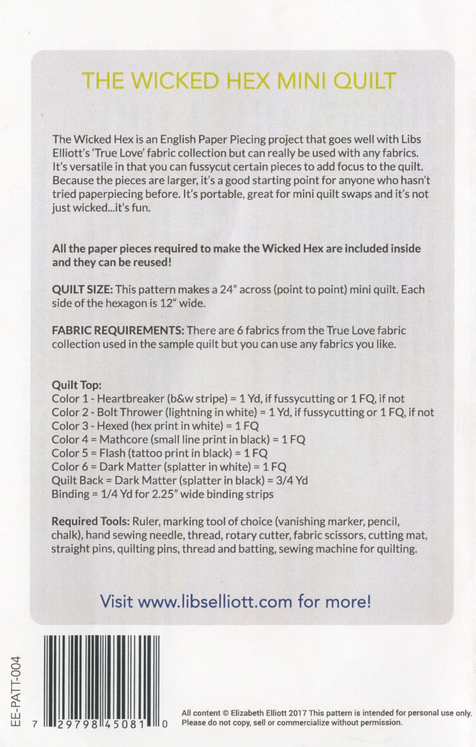 Finished Quilt Size: 24in across (point to point). The Wicked Hex is an English Paper Piecing project that goes well with Libs Elliott’s True Love fabric collection (Andover Fabrics). It’s versatile in that you can fussy-cut certain pieces to add focus to the quilt. Because the pieces are larger, it’s a good starting point for anyone who hasn’t tried English Paper Piecing before. It’s portable, great for mini quilt swaps and it’s not just wicked...it’s fun. All the paper pieces required are included, as well as the pattern.