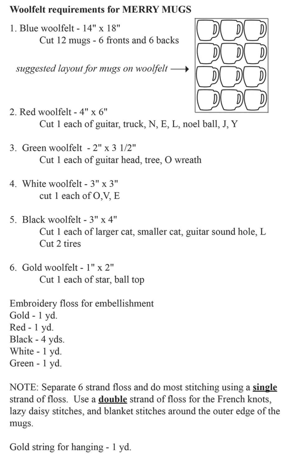 A mug of steaming coffee, creamy hot chocolate or spicy comforting tea warms both bodies and souls. These Merry Mug ornaments have the same effect. Make them for the tree or for gift giving. Each mug is open at the top and can be filled with gift cards or other small treasures. Size is approximately 3-3/4in x 4-1/8in. Kit includes wool felt, embroidery floss and gold string plus precise patterns and illustrated instructions to make 6 mug ornaments.