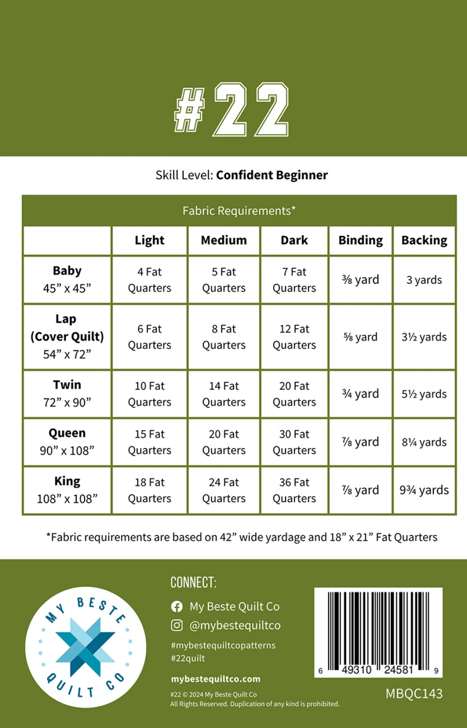 #22 is a scrappy pattern that uses fat quarters. A single block that when put together creates a star. It is a great pattern to introduce constructing a quilt using partial seams. The pattern has instructions for Baby (45"" x 45""), Lap (54"" x 72""), Twin (72"" x 90""), Queen (90"" x 108"") and King (108"" x 108"").