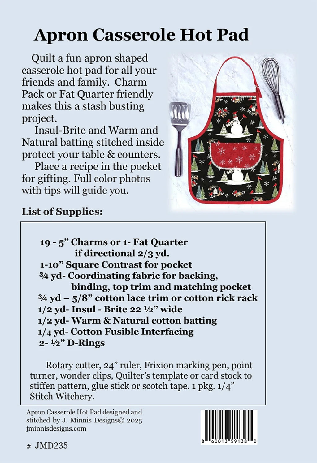 Quilt a fun apron shaped casserole hot pad for all your friends and family. Pattern is Charm Pack or Fat Quarter friendly, making this a great stash busting project. Make one for every holiday. 20" High x 17 wide makes 1 Place a recipe in the pocket for gifting. Use Insul-Bright for lining to make heat resistant.