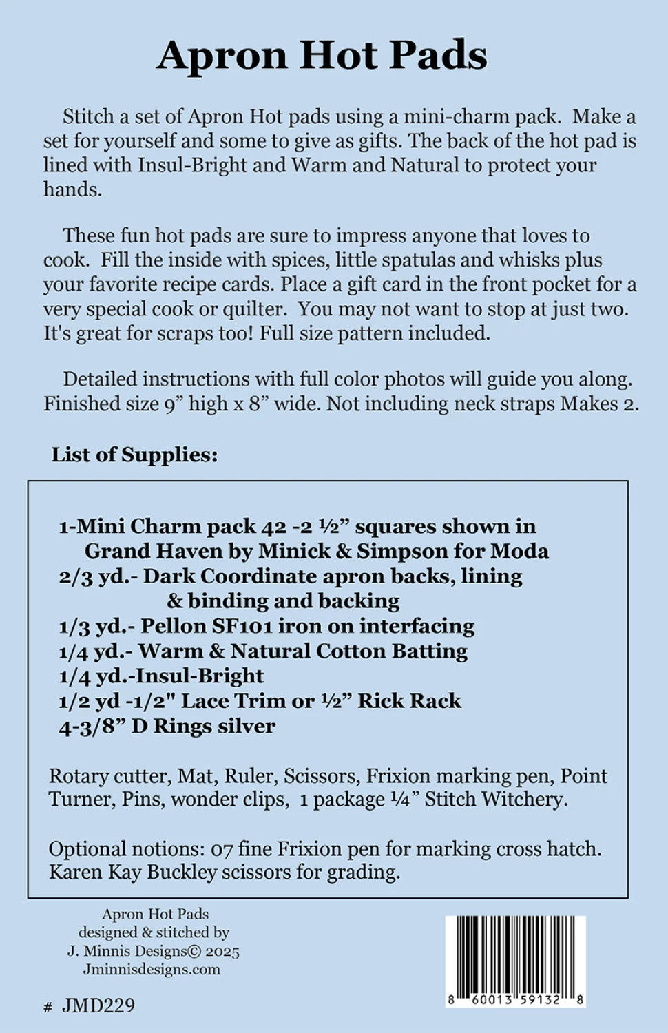 This is such a lovely hot pad pattern! Stitch a set of Apron Hot pads using a mini-charm pack. Make a set for yourself and some to give as gifts. The back of the hot pad is lined with Insul-Bright to protect your hands. These fun hot pads are sure to impress anyone that loves to cook. Fill the inside with spices, little spatulas and whisks plus your favorite recipe cards. Place a gift card in the front pocket for a very special cook or quilter. You may not want to stop at just two. It's great for scraps too! Full size pattern included.
