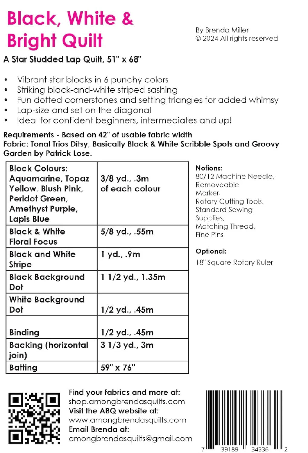 A Star Studded Lap Quilt The Black, White & Bright Quilt is a stunning lap quilt measuring 51" x 68". Featuring vibrant star blocks in six bold colors, this design is brought to life with striking black-and-white striped sashing, playful dotted cornerstones, and whimsical setting triangles. Set on the diagonal for added flair, this quilt is perfect for confident beginners, intermediate quilters, and beyond!