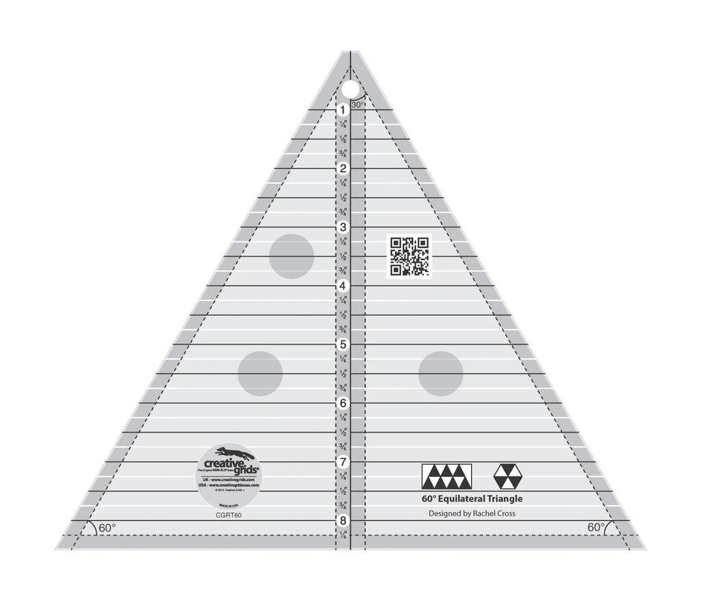 Use this 60 Degree Equilateral Triangle Ruler designed by Karla Alexander for Creative Grids® to cut triangles from strips up to 8-1/2in wide.