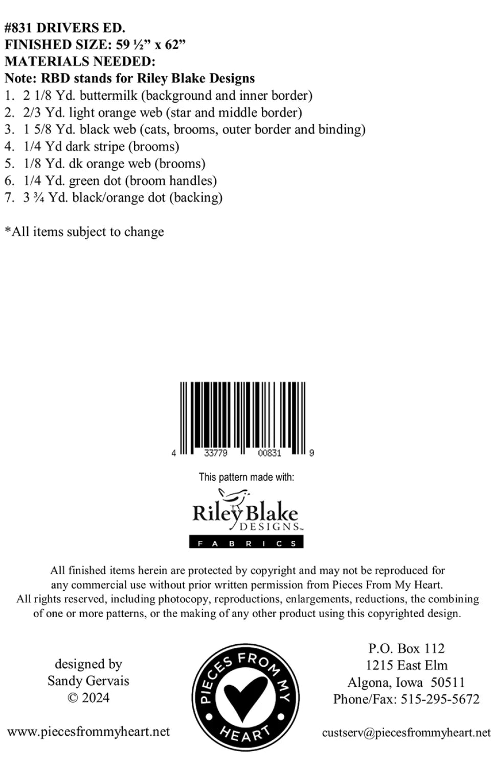 How would you like to be the instructor for this drivers ed class? And you thought teenagers were difficult. Fabrics from the line Fright This Way by Sandy Gervais for Riley Blake Designs are featured in this pattern Finished size: 59 1/4" x 62"