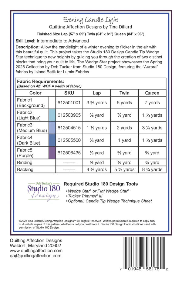 Allow the candlelight of a winter evening to flicker in the air with this beautiful quilt. This project takes the Studio 180 Design Candle Tip Wedge Star technique to new heights by guiding you through the creation of two distinct blocks that bring your quilt to life. The Wedge Star project showcases the Spring 2025 Collection by Deb Tucker from Studio 180 Design, featuring the “Aurora” fabrics by Island Batik for Lumin Fabrics.